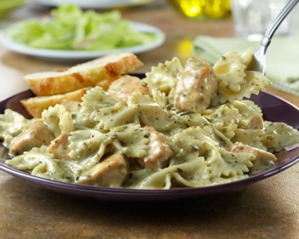 Stir the soup, pesto sauce, and milk in the skillet and heat to a boil. Reduce the heat to low. Cook for 5 minutes or until the chicken is cooked through. Stir in the pasta and cook until the mixture is hot and bubbling.
