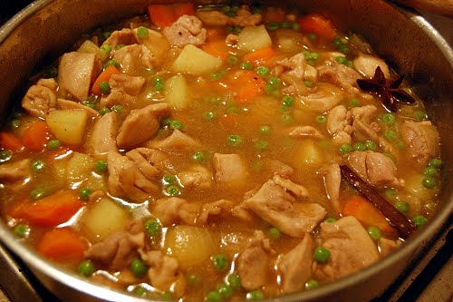 Heat a large, deep saute pan over medium heat, add a tablespoon or two of sunflower oil and then saute the onions until softened. Add the chicken and cook until you don’t see anymore raw bits. (Some chopped garlic would be good at this stage too.) Deglaze the pan with a good slug of Shaoxing wine and let the alcohol bubble away. Toss in the potatoes, carrots, star anise, cinnamon, and cloves (if using) and stir through.
