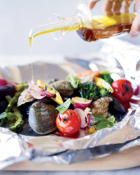 Tear off eight 16-by-18-inch pieces of heavy-duty foil. Layer the sheets in pairs. Divide the oysters, clams and mussels among the four pairs of foil and drizzle with olive oil. Arrange the vegetables over the shellfish and drizzle with more olive oil. Add a pinch of salt, a basil sprig and 1 tablespoon of water to each. Fold the foil tightly into neat rectangular packets.
