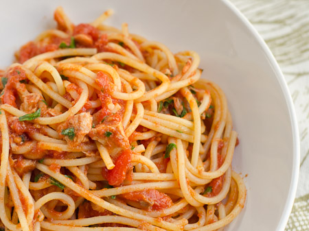 Add the spaghetti back to the pot and cover with the tuna sauce. Toss to coat. Cover and let sit for 3 minutes. Enjoy!