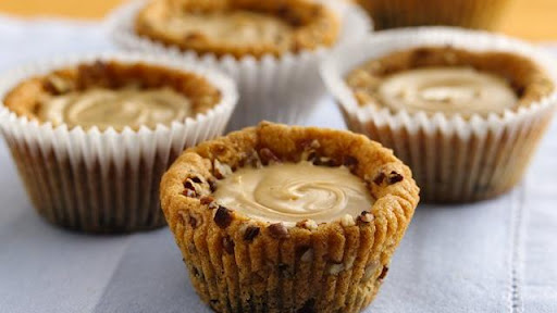 2. In small bowl, place pecan chips. Lightly coat each cookie with pecans; press into dough. Place each cookie, flat side down, in muffin cup.