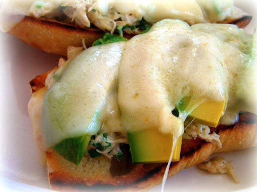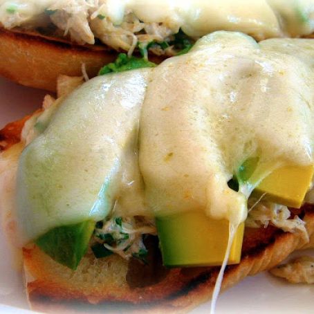 Add a mound of crab salad on each slice of bread, add 3-4 avocado slices and top with cheese.