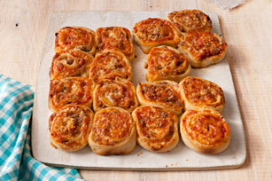 ROLL up, starting at one long side; cut into 16 pinwheels. Place, cut sides down, in 8-inch square pan sprayed with cooking spray; sprinkle with Parmesan.