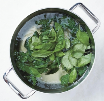 Bring a large pot of salted water to a boil. Fill a large bowl with ice and water and set aside nearby. Cook the basil in the boiling water until bright green, about 10 seconds. Transfer to the prepared ice bath using a slotted spoon. Let the basil cool, then drain and squeeze dry.