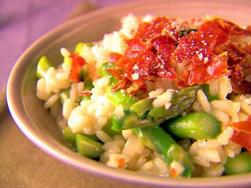 In another medium saucepan, melt 1 tablespoon of the butter. Add the shallot and cook until tender, about 3 minutes. Add the Arborio rice and stir to coat in the butter. Continue toasting the rice, stirring constantly, for about 3 minutes more. Add the Champagne and simmer until the liquid has almost evaporated, about 3 minutes. Add 1/2 cup of the simmering broth and stir until almost completely absorbed, about 2 minutes. Continue cooking the rice, adding the broth 1/2 cup at a time, stirring constantly and allowing each addition of broth to absorb before adding the next, until the rice is tender but still firm to the bite and the mixture is creamy, about 20 minutes total. Remove from the heat. Gently stir in the asparagus, remaining butter, Parmesan, salt, and pepper. Spoon the risotto into serving dishes and garnish by breaking the crisp prosciutto into smaller pieces over the top of the risotto. Serve immediately.