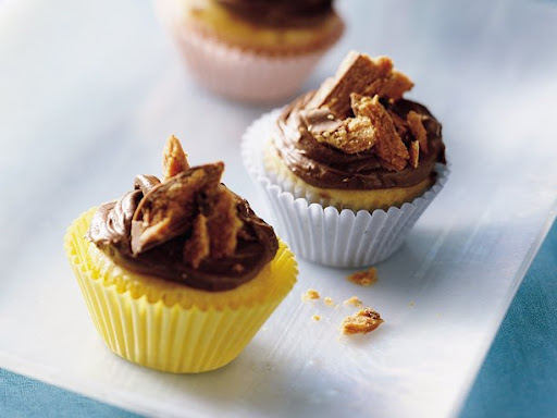 4 Frost cupcakes with frosting. Coarsely chop remaining candy. Place candy pieces on frosting, pressing down slightly. Store loosely covered.