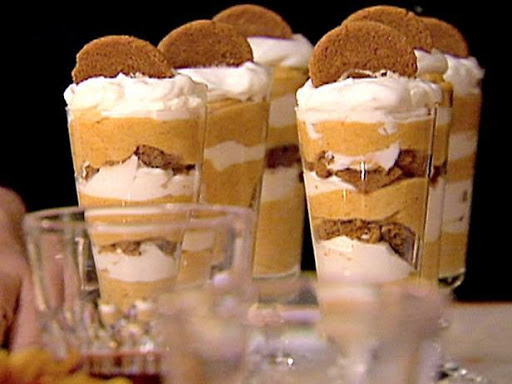 To assemble, spoon some of the pumpkin mixture into parfait glasses, add a layer of whipped cream, then some chopped cookies. Repeat, ending with a third layer of pumpkin. Cover with plastic wrap and refrigerate for 4 hours or overnight. To serve, decorate with whipped cream and slivered crystallized ginger.