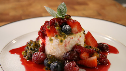 Mascarpone with vanilla 2/3 and 1/3 cream. Cut into slices and garnish.