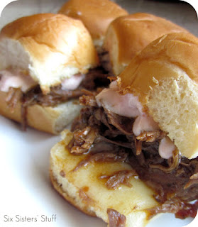 Place a spoonful of shredded beef on top of each roll with Swiss cheese on it. Spread Creamy Chipotle sauce on the top half of each roll. Assemble each slider by placing the top half of the roll on top of the bottom.