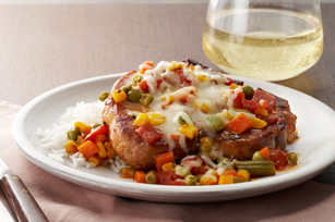 HEAT large skillet sprayed with cooking spray on medium-high heat. Add chops and vegetables; cook 2 min. or until bottoms of chops are browned. Turn chops over.
