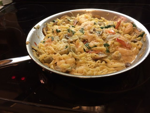 We used only a pound of shrimp, and just about doubled the spinach and mushrooms, and served it over rice pilaf. This was soooo good, we wished we were serving company. (Photo is my own.)