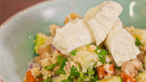 To assemble the salad, add the cooked pumpkin and remaining vegetables to the couscous, along with the chickpeas and dressing. Garnish with goats cheese and coriander
