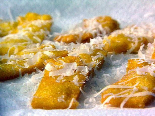 Cut the polenta into 2 by 1-inch pieces. Heat the oil in a heavy large skillet over medium-high heat. Working in batches, fry the polenta pieces until golden brown on all sides, about 3 minutes per side. Using tongs, transfer the polenta pieces to paper towels and drain. Place the polenta pieces on a baking sheet and keep warm in the oven while cooking the remaining batches.