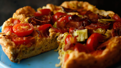 Bake bacon on a slotted pan to crisp, 12-14 minutes. Coarsely chop and reserve.
