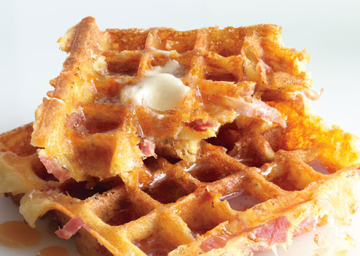 Coat waffle iron with non-stick vegetable oil spray. Pour batter onto iron, spreading it into corners (amount of batter needed will vary according to machine). Scatter 1 rounded Tbsp. ham and 1 Tbsp. white cheddar over each waffle. Cook until golden brown and cooked through. Transfer to a baking sheet; keep waffles warm in oven between batches. Serve with butter and warm maple syrup.