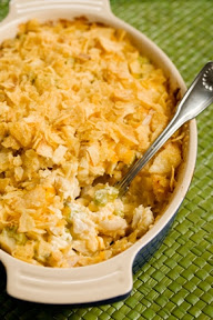 In a large mixing bowl combine the chicken, celery, almonds, salt, pepper, lemon juice, mayonnaise, and cheese. Place the mixture in the prepared baking dish. Spread the crushed potato chips on top. Bake for 20 minutes, or until bubbly.