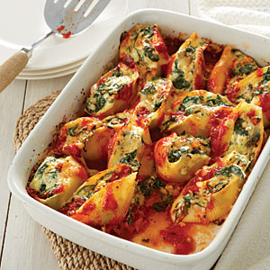 Spread half of tomato sauce in a 9-by-13-inch dish. Fill each shell with 1 heaping Tbsp. ricotta mixture and place open side up in dish. Spoon remaining sauce over shells; sprinkle with remaining mozzarella. Cover with foil and bake 30 minutes. Remove foil and bake 20 to 30 minutes, until bubbling.