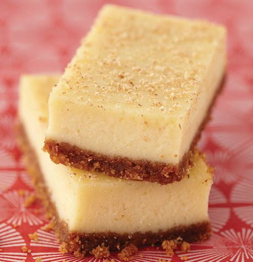 I was raised in a Jewish family in Los Angeles, so I didn't celebrate a white Christmas," Elizabeth Colling says. But there was always eggnog. "I just love that flavor." She worked the holiday drink into cheesecake bars, dense on the bottom, silken on top. She spikes them with brandy for a grown-up taste and dusts them with fresh nutmeg.