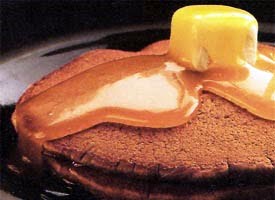 Cook until bubbles break on surface. Turn; cook other sides 1 minute. Top each serving of pancakes with cube of cream cheese and sauce.