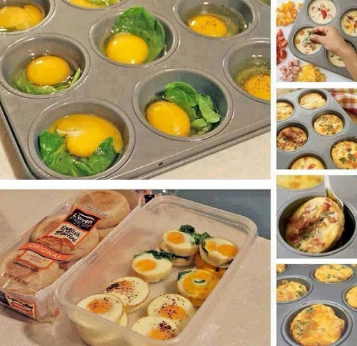 Prepare your tools for the awesome breakfast: spray the muffin tin and preheat the oven (400 °Fahrenheit). Take the eggs and break each into a muffin cup. Don’t forget to place a leaf of lettuce in all of the cups. Now, mix the milk with cheese, the `Bisquick` and ham into a large bowl. Transfer scoops of this mixture (once it’s all well combined) with the help of a spoon into each muffin cup equally. Place the tin in the oven for 18 – 22 minutes. Check to see if the muffin has turned golden brown and take out from the oven. After 5 minutes of letting them cool off a bit, remove from the tin and place between half-cut muffins. It’s delicious!