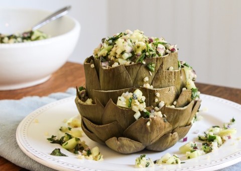 Spoon the tabbouleh into the cavities, allowing it to spill down the sides of the artichokes. Serve chilled or at room temperature.