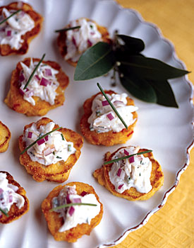 Arrange warm fritters on platter. Top with crab mixture and garnish with additional chives.