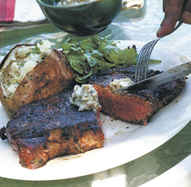 Slice the steaks across the grain about 1 1/2-inches thick; dont separate the slices. Keeping the steak slices together, transfer the steaks to the skillet and top with the butter. Cover the grill and cook the steaks for 5 minutes for medium rare. Transfer the skillet to a trivet.