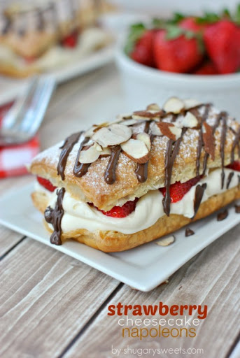 4.Fill bottom of each "sandwich" with cheesecake filling. Top with strawberries. Place top of puff pastry over strawberries and sprinkle (generously) with powdered sugar. Drizzle melted chocolate over each Napoleon and immediately sprinkle with Fisher's Sliced Almonds. Serve immediately or refrigerate
