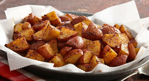 Reduce temperature to 375°, turn potatoes over and sprinkle with the bacon, garlic, and Parmigiano-Reggiano.