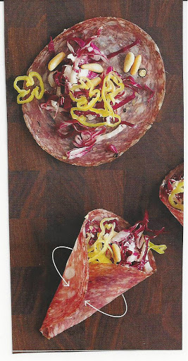 2. Arrange soppressata on a work surface and mound some radicchio salad on each piece. Roll up the salad in the soppressata slices to form cones and serve.