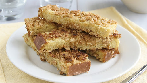 Heat griddle or large skillet over medium heat; melt butter on griddle. Dip bread pieces, one at a time, in egg mixture, then coat with cereal (pressing in with hands, if needed). Cook on hot griddle about 4 minutes on each side until golden brown. Serve warm.