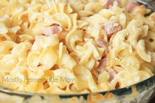 In a large mixing bowl, whisk eggs and sour cream until smooth. Add ham, minced onion, salt, and cheese. Gently fold in egg noodles, turning to coat well. Transfer to a 2 quart casserole dish and bake at 350 for 30 minutes, watch the casserole during the last 10 - you might need to put foil over to prevent the edges from getting too brown.