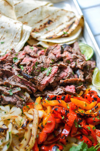 4. Thinly slice the steak, against the grain. Slice the onions in half and separate the rings. Slice the peppers. Serve with the tortillas, lime wedges and toppings of your choice.
