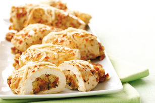 Place chicken breasts, top sides down, on cutting board. Spread chicken with stuffing mixture. Starting at 1 narrow end, tightly roll up each breast. Place, seam sides down, in 13x9-inch baking dish; drizzle with dressing.