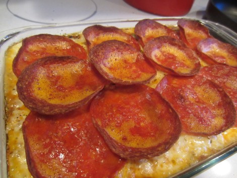 Remove dish from the oven and add your toppings–sprinkle extra meat, veggies, cheese, and whatever else directly on the casserole and make sure you add the pepperoni last so it seals in all the flavor and makes a nice little “crust” on the outside.