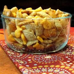 Preheat an oven to 225F. Combine the wheat cereal, corn cereal, rice cereal, cheese-flavored crackers, pretzels, and mixed nuts in a large bowl; set aside.