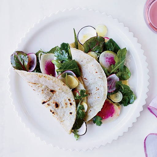 Arrange the warm corn tortillas on a large baking sheet in a single layer. Sprinkle the shredded Jack cheese on the tortillas and broil 6 inches from the heat until the cheese is melted, about 1 minute. Pile the salad on the tortillas, fold them in half and serve right away.