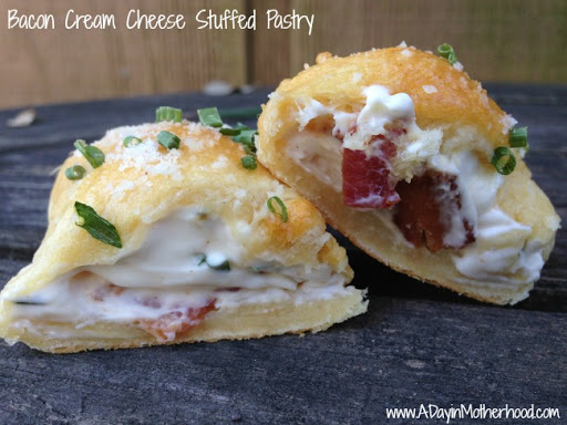 Slice and cube bacon and cook until almost crisp. At about the half way mark of cooking, add the garlic. Dish out the cream cheese in a bowl and add chives. When bacon is done, place it on a paper towel to drain and cool. When cool (about a minute or two), add it to the cream cheese mixture. Meanwhile, roll out croissants on a non stick, oven safe surface. Place a spoon size dollop of cream cheese mixture on end of croissant. Roll and close the edges. Bake according to croissant can instructions. Melt the butter in a dish. Brush over top of croissant. Sprinkle Parmesan and chives and serve.