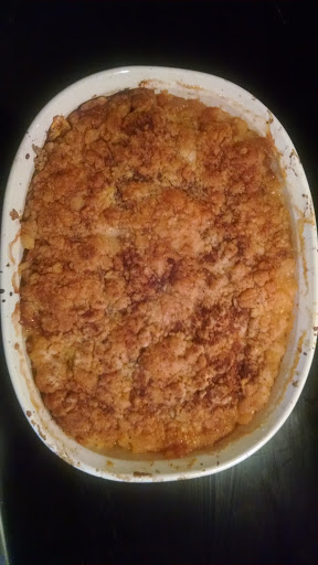 SPRAY 1 9 INCH BAKING DISH WITH PAM. FILL DISH 3/4 FULL WITH FRUIT - ABOUT 3 TO 4 CUPS. MIX FLOUR, SUGAR, BAKING POWDER AND EGG UNTIL CRUMBLY. SPRINKLE ON TOP OF FRUIT AND THEN POUR MELTED BUTTER ON TOP AND BAKE AT 350 DEGREES FOR 30 TO 45 MINUTES.