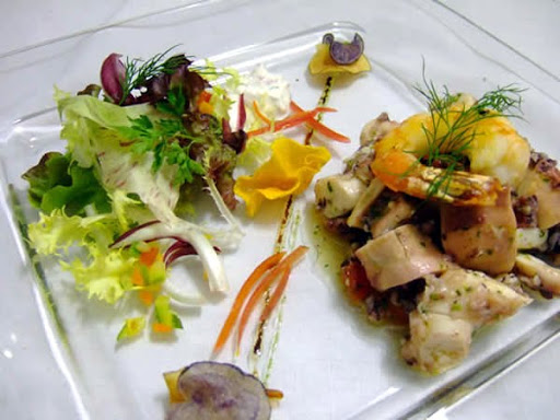 Saltearemos la pasta con la vinagreta de albahaca y le pondremos el pulpo también bañado con la vinagreta. Decoraremos la ensalada con unas cuantas dolsetas ( hierba de los canónigos o algo así ).