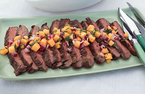 Toss cantaloupe, onion, parsley, mint, vinegar and oil in a bowl. Set aside. Heat a grill, grill pan or large skillet over high heat. Season flank steaks on both sides with salt and pepper. Cook 5 to 8 minutes on each side for medium rare, 8 to 10 minutes per side for medium and 10 to 12 minutes per side for well done. Remove from heat and allow to rest on a clean cutting board for 5 to 7 minutes. Cut steak diagonally into 1/8-inch-thick slices and transfer to a platter. Spoon half the relish on top. Serve remaining relish on the side.