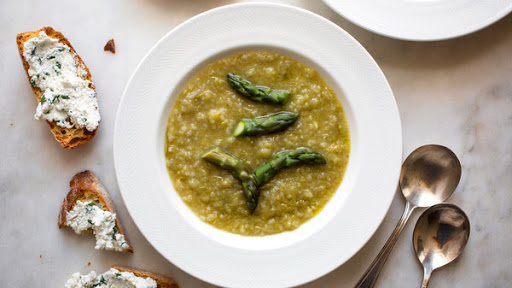 Cut asparagus stalks into thirds, separating tips, middles and ends. In a medium pot, bring 2 cups salted water to a boil. Add tips and cook until just tender, 3 to 4 minutes. Use a slotted spoon to transfer to a bowl of ice water to cool. Drain and reserve for garnish.