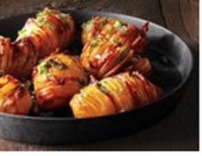 Peel all the potatoes and, as you peel them, put them in a large container with 1 gallon water and the lemon juice to keep them from browning. Once they are all peeled, remove them from the water and pat dry. Then slice the potatoes about 1/4-inch apart and about three-quarters of the way through to create a series of uniform slices so that they are still joined together at the bottom. This should create a fan type finish to the potatoes.
