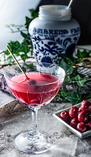 Transfer onto a chilled cocktail glass and garnish with candied amarena cherries and a small curl of lemon peel (optional).