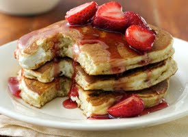 In small bowl, mix strawberries and syrup; top pancakes with strawberry mixture.