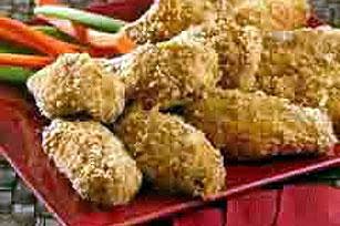 COAT chicken with hot pepper sauce, then dip in crumb mixture, turning to evenly coat both sides of each wing piece. Place in single layer on greased baking sheet.