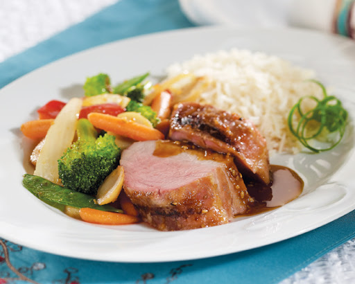 3.Preheat grill pan over medium heat or prepare outdoor grill for direct grilling over medium heat. Remove pork from marinade; discard marinade. Place pork in grill pan and cook 12 to 14 minutes or until pork reaches an internal temperature of 145°F, turning pork occasionally. Pork should be slightly pink in center. Slice pork diagonally to serve and drizzle with teriyaki sauce.