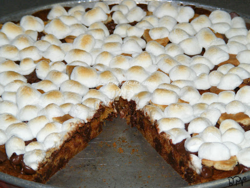 Cookie dough is pressed into a pizza pan and baked then immediately topped with milk chocolate candy or chips, small graham cracker pieces, and mini marshmallows then broiled until lightly browned. Ooey, gooey s'more deliciousness!!