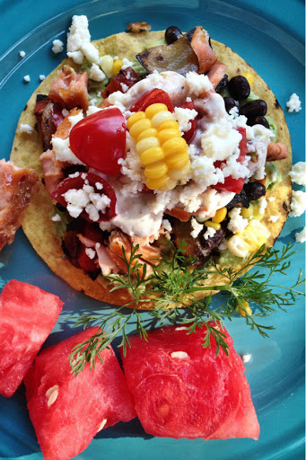 Spread the guacamole on top of the prepared tostada shell. Layer the cooked salmon on top, spooning the bean mixture next. Add a small amount of sour cream mixture, ending with cheese, tomatoes, and fresh cilantro. Serve!