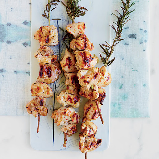 Light a grill. Remove the chicken from the marinade and thread the pieces onto the rosemary skewers; discard the marinade. Oil the grate and grill the chicken over moderate heat, turning occasionally and basting with the reserved marinade, until golden and cooked through, 15 to 20 minutes. Serve with lime wedges.